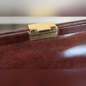 This is such a great vintage Etra purse! It measures 6" tall (10" with handle) and is 8" wide at the top and 9" wide at the bottom. It's approximately 4" across at the bottom. The handle stands about 4-1/4" from the top edge of the purse. It's a pretty cinnamon color with brown lining with goldenrod accents. It features 2 interior pockets. There are a few light scuffs and scratches, and the metal could do with a bit of polishing with a polishing cloth, but there are no major flaws to note. Comes from a smoke-free home.