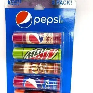 Pepsi 8 Piece Flavored Lip Balm Set. New in packaging. Pepsi Cherry Vanilla, Mountain Dew, Mug Root Beer, Pepsi Wild Cherry, Mountain Dew LiveWire, Pepsi, Mountain Dew White Out, Diet Pepsi