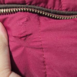 Missing hood...gold snaps on outside and small maroon button line the inside of collar. Snag on left side that is hardly visible when open and hidden when zipped up.