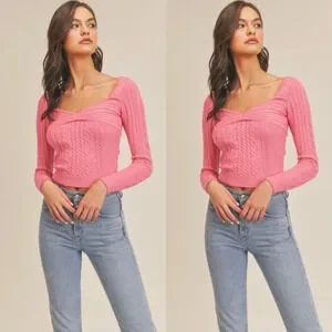 * Cable knit sweater top. Fitted. Sweetheart neckline.