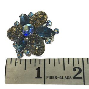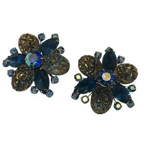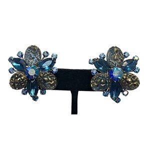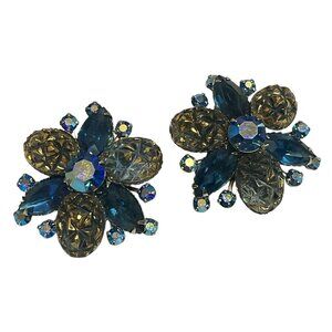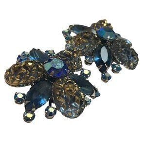 VTG Judy Lee? Molded Blue AB Rhinestone Earrings Clip On Silver Tone EXC GIFT