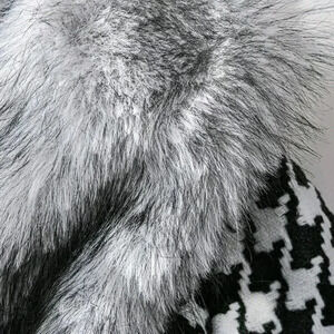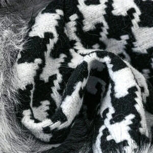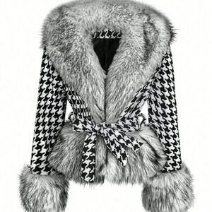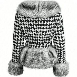 Black And White Casual Women's Faux Fur Trimmed Woolen Houndstooth Jacket
