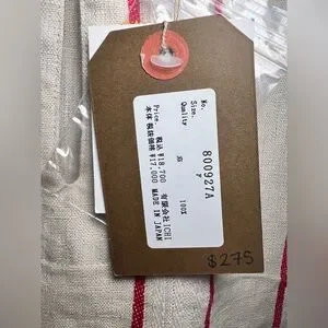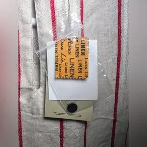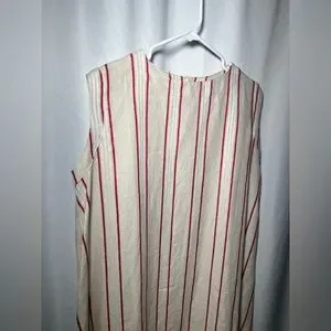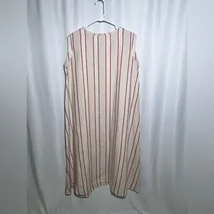 Gorgeous natural fiber 100% linen dress. Sleeveless, slightly curved hem, with gorgeous tan, cream and red stripe pattern. Keyhole button closure in back.