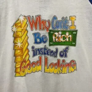 • Bold retro iron on (?) graphics ‘Why can’t I be rich, instead of good looking’