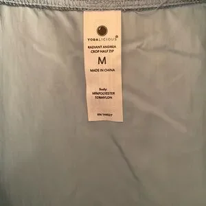 This is a brand new with tags Yogalicious Radiant Andrea Half Zip Crop Jacket. Size medium. The manufacturer shade is Forget Me Not, a pretty blue. Lightweight - like a windbreaker. 68% polyester, 32% nylon.