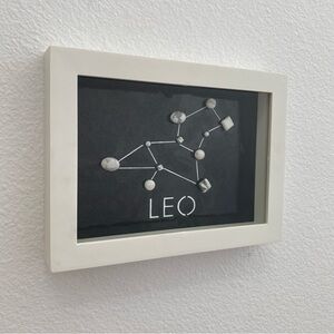New, celestial modern framed art - for wall decor or display on a tabletop or shelf! Personal Leo star constellation designed with moonstone and white howlite beads, is showcased in a shadow box. The backboard of the shadow box is shiny black. An original piece of artwork made by me.