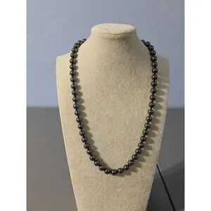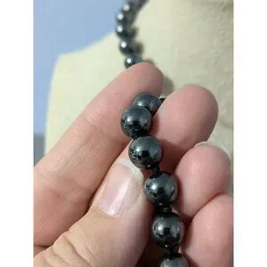 This hematite beaded necklace features a 24-inch strand of reflective, individually knotted beads with an ornate clasp.