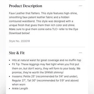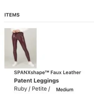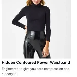 Faux patent leather in color Ruby. High shine, hidden contoured waistband. Stock pictures in black for show.