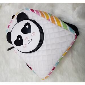 This medium quilted backpack is so adorable! This little panda has embroidered pink cheeks and nose! The sides and bottom are a rainbow pattern. Straps are black with Betsy Johnson Luv/kiss lip, pattern on them.