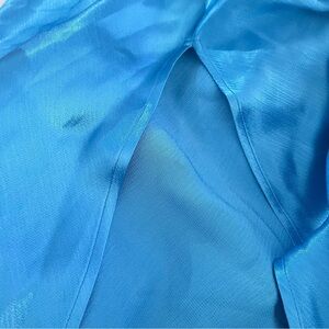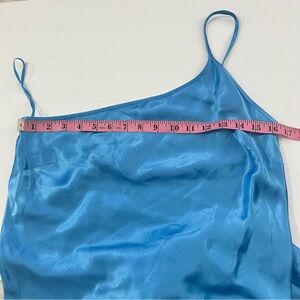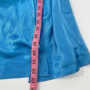 Features such as: one shoulder neckline with rouleau thin shoulder strap, bias cut with front leg slit and made with asymmetrical bright blue satin fabric