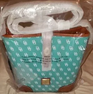Brand new "Gretta" DB signature print crossbody bucket bag, made of water repellent coated fabric. It has never been removed from the original packaging. There is nothing wrong with it at all, I just never got around to using it and am now using my tiny bags. I do not buy just to resell, just an avid collector. Dooney calls this color "Sea Foam." The 1st pic is a stock photo, just to show what it will look like out of the protective materials. The rest are of the actual bag you will receive exactly as it came to me. This style is not available on the site at this time. Please see the above pic for the details and dimensions. Would make a great gift. Will ship out quickly.