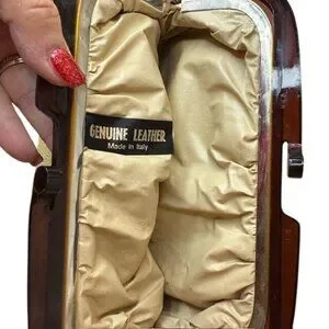 This elegant vintage clutch is crafted from genuine leather with a sturdy wooden frame. It features a spacious interior, making it suitable for carrying essentials in style. The sophisticated design and classic yellow hue offer a timeless appeal, making it a versatile accessory for elevated ensembles.