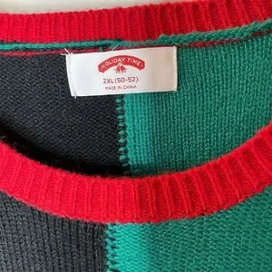 Keywords: Ugly Christmas sweater, 2XL, Santa Claus, holiday sweater, multicolor, acrylic knit, winter wear, casual sweater, party sweater, graphic print, machine washable, pre-owned, excellent condition, China, bold color blocking.