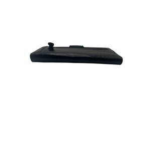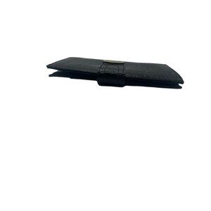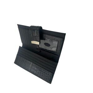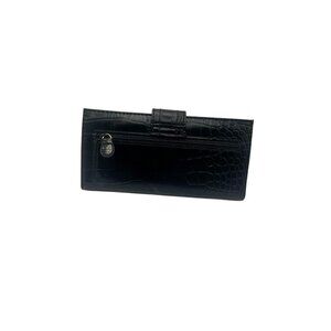 This Liz Claiborne wallet is a stylish addition to any woman's accessory collection. The black faux leather material is accented with a snap closure and alligator theme, making it a unique piece that is sure to turn heads. Measuring 8 inches in length and 4 inches in width, it is the perfect size to carry all of your credit cards and essentials. The wallet is designed with a snap closure and features various compartments to keep your belongings organized. Ideal for women who want a functional and fashionable accessory, this wallet is a must-have.