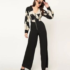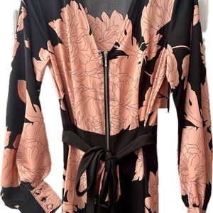 This stunning coral and black floral 2 piece jumpsuit is quite a statement piece. The vintage style evokes old Hollywood glamour. It can be worn with or without the long, flowing skirt overlay, which is affixed with buttons and ties at the waist. It is long (33” inseam) and needs to be worn with heels (unless you’re tall). Flat waist measurement is 14” and the chest (pit to pit) is 17 inches. Condition is new with tags/never worn.