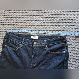 Denizen by Levi's Ultra High Rise Crop Flare Jeans in a Size 16 (33). Dark Wash. There are no signs of wear that I can see. Great pair of jeans with stretch.