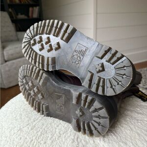 The platform: A fierce adaptation of the 8-eye boot with chunky platform soles and rugged tread for extra empowerment; Made with original grooved edges, yellow stitching and heel-loop.