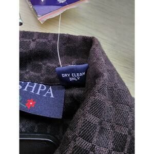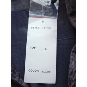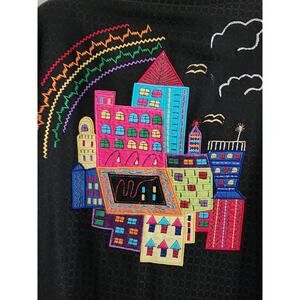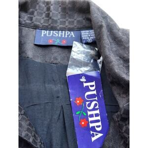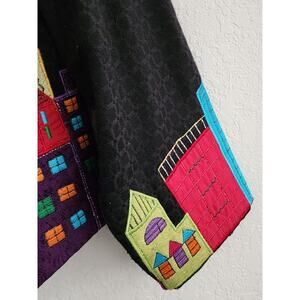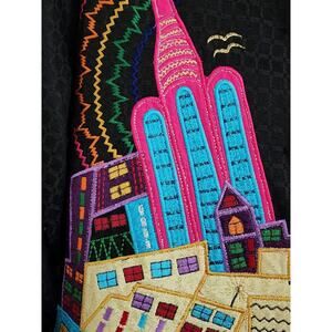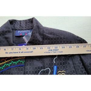 Nice light weight jacket that could be used as a top. It is Pushpa brand that is new with the tags. The jacket is a black material. There are numerous appliques that are a bright city scape on the front, back and on the end of the sleeves. There are metallic threads throughout to give it a bit of a sparkle. It has a nice weight and feel to it. The size is a small, but it looks like generous sizing. The outside is a cotton and the lining is a rayon. There are nice black buttons down the front. SIZE SMALL