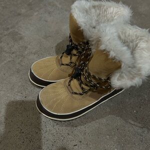 Stay warm and stylish with these tan winter boots featuring a cozy faux fur lining. Perfect for cold weather, these boots offer both comfort and durability.