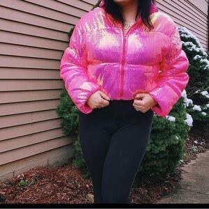 Awesome coat, lightweight, hot pink sequin jacket. Perfect for the holidays or the perfect gift. Elastic at wrist, zip up coat. Not bulky! Ordered from boutique, not worn. BNWT.