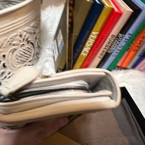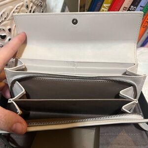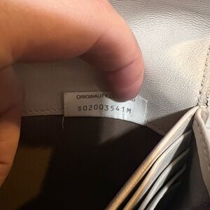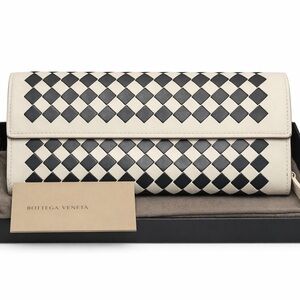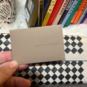 Elegant Bottega Veneta wallet. Features a black and white checkered design. Sleek and stylish.