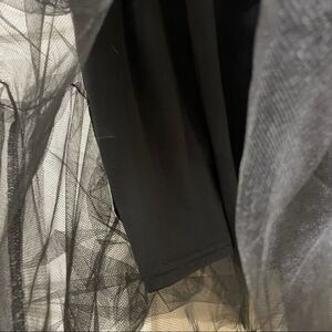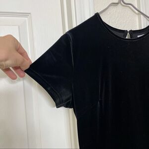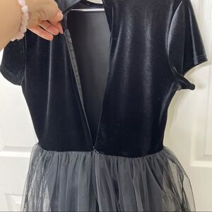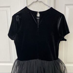 Short sleeve black velvet top attached to black tulle skirt that hits just below the knees.