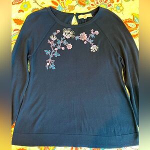 NWT ~ Loft navy blue long sleeve light weight sweater with embroidered flower detailing in front