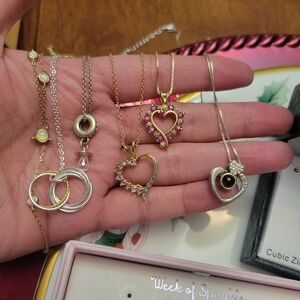 6 silver necklaces, 2 gold toned 925 heart pendants with garnet and amethyst, etc, all stamped