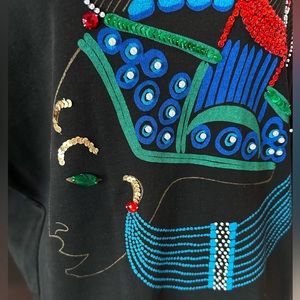 Oleg Cassini Milano New York Knit Sophisticates Vintage Sequins Beaded Woman, Unique Top. Size Small. Excellent used condition. Black knit top with shoulder pads. Lots of intricate detail, all in perfect condition. Approximate measurements while laying flat - 25" pit to pit, 27" length, 23" sleeve length.