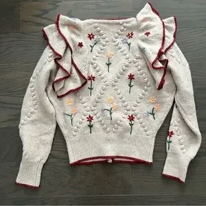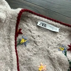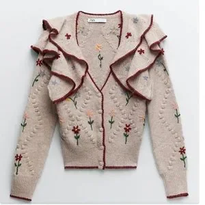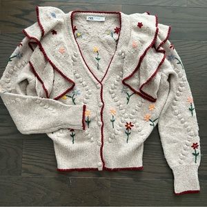 Blogger favorite and hard to find. Great condition. super soft Zara cardigan with floral embroidery. Long sleeves. Ruffle shoulders. Burgundy trim. The sweater is a taupe color. Size M. First pic shows me wearing it.