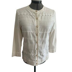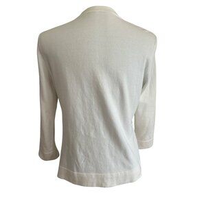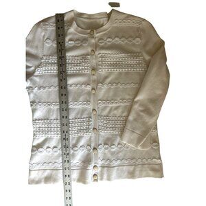 Elevate your wardrobe with this timeless cardigan, featuring a classic button-up design in a sophisticated white hue. The textured knit adds dimension and elegance, making it a versatile piece for any setting. Soft and comfortable, it’s the ideal addition to layer over your favorite outfits throughout the seasons. Please go by measurements. There is no makers label or size label . In great condition.