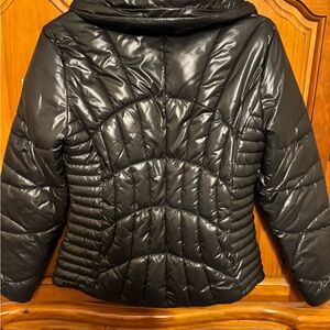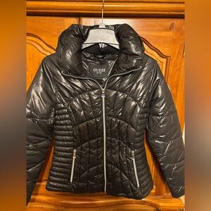 Women’s Guess black pufferfer jacket new no tags never worn size smalll silver hardwarere zipper closure 2 front zippered pockets