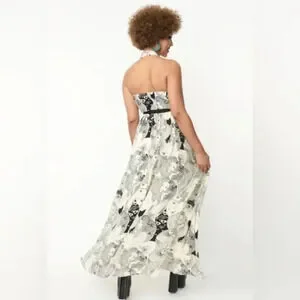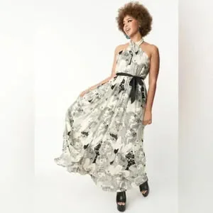 This stunning maxi dress is crafted in a lightweight woven fabric that dances with the goddess of love and beauty in a marvelous psychedelic black and ivory print throughout. The halter neckline is secured with back buttons and framed by a sultry sleeveless silhouette while the sweeping maxi skirt is outfitted with side pockets.