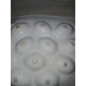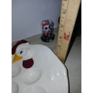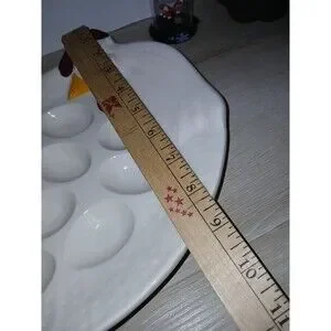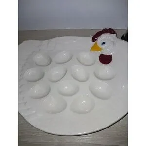 This vintage Treasure Craft egg plate is a must-have for any collector. The round, white ceramic plate features a charming chicken shape and is perfect for serving deviled eggs or other delicious appetizers. The plate measures 12 inches in length and 9 inches in width, with a height of 2 inches.