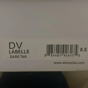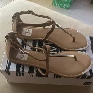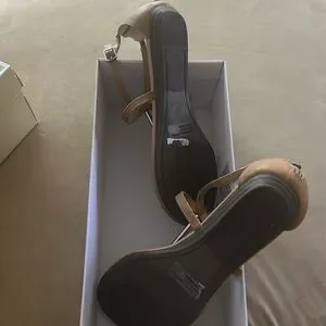 Dark Tan, Worn twice. Metal toe and T-strap detail. Slim straps. Adjustable buckle ankle strap. Back zipper closure. Padded footbed. Low wedge heel. Imported.