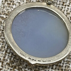 Faceted blue stone, possibly chalcedony, in sterling silver.