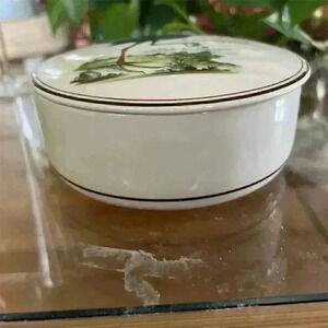 Enhance your space with the Villeroy & Boch porcelain jar, a part of the esteemed Birds (Paradiso) series. This collectible piece features a meticulously crafted illustration of a noble bird, embodying the series' dedication to capturing the splendor of avian life. The jar's vibrant multicolor palette adds a serene natural element to any setting. Perfect for collectors or as a distinguished decorative item, this jar is a harmonious blend of beauty and utility. With a width of 5.5 inches, it's in pristine condition and awaits to enrich your collection or home decor.