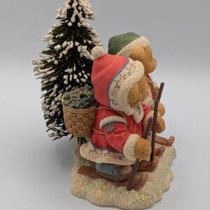 Celebrate the holiday season with the vintage Cherished Teddies Segrid, Justaf & Ingmar triple figurine from 1998. Titled "The Spirit of Christmas Grows In Our Hearts," this charming piece depicts skiers dragging a Christmas tree, embodying the festive spirit. The figurine is pre-owned but remains in excellent condition, a testament to its careful preservation over the years. Although the original box shows wear due to age, it adds a touch of authentic vintage charm.