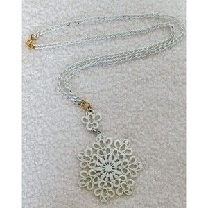 Vintage White Enamel Medallion Filigree Snowflake Pendant Necklace