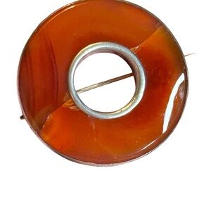 Elegant amber brooch with a circular design. Perfect for adding a touch of vintage charm. Antique Scottish Carnelian round donut Circular Brooch sterling silver 925 appx 1.5” wide natural crack line acrosss the centrr of the brooch no matal purity stamps. tested as sterling Antique item over 100 yrs old J2024-128