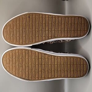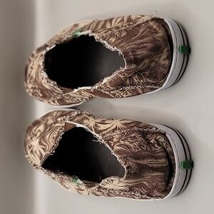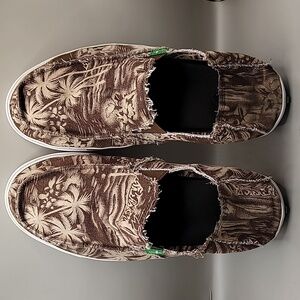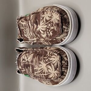 SANUK Sidewalk Surfers Shoes Men's Sz 9 Brown Frayed Palms Canvas Slip-On Beachy