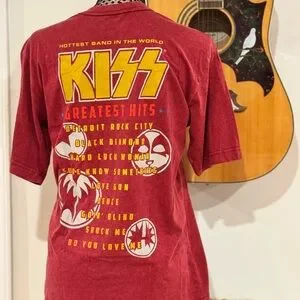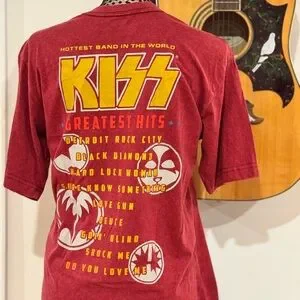 Rock out in style with this vibrant red KISS graphic t-shirt for kids. Perfect for young fans, this shirt combines comfort with iconic band imagery.