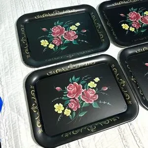 Vintage Black Floral Decorative Serving trays Toleware Plates Flowers 17 X 13 In