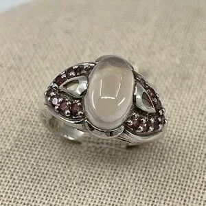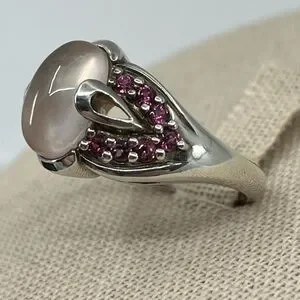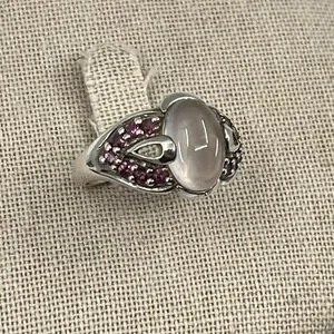 Add a touch of vintage elegance to your collection with this beautiful sterling silver ring, featuring a luminous moonstone center paired with vibrant purple accent stones. Part of my estate collection, this timeless piece likely dates back to the 1980s or 1990s and has been well-kept and rarely worn.