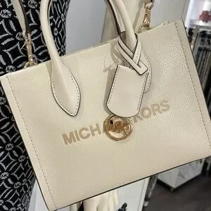 Crafted from pebbled leather, the Mirella crossbody bag features smooth accents and a polished MK charm. Its compact size is perfect for days about town. Carry it by the sturdy top handles or over the shoulder via the detachable strap.