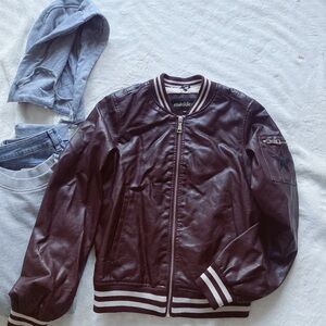 Madden Girl faux leather varsity bomber jacket with detachable hood!