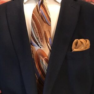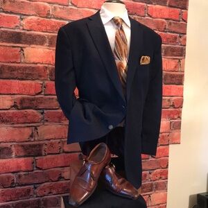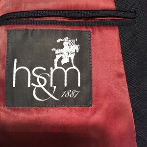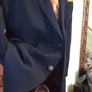 Elegant Vintage Harts Schaffner Marx blue blazer size 52 Long only worn once it’s 100% lightweight wool perfect for business, formal, or just Casual wear with jeans or khaki pants. Fully lined notched lapel flap pockets 2 front antique silver buttons and traditional Center vent in the back. Armpit 27 sleeves length 26 coat length 33 shoulder 22 accessories and shoes not included only the Blazer. Dillards price $ 399. The only thing a small tearing inside the lining it was fixed photo included