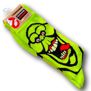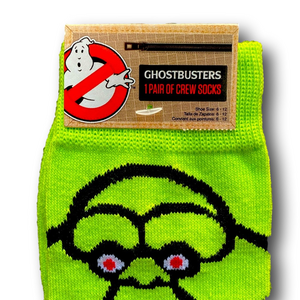 Funny Novelty Crew Socks. Ghostbusters Slimer design. From the famous 1980s classic movie Ghostbusters. Neon green, black, red & white colors. 97% polyester, 3% spandex. Brand new with tags attached. Great for gifts or stocking stuffers!