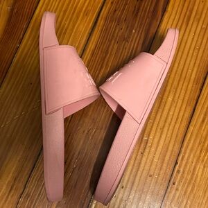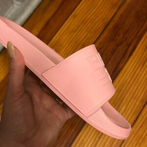 Description: pink slide on sandals with “BRIDE”