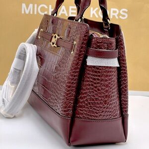 NWT MICHAEL MICHAEL KORS Reed Large Croc-Embossed Leather Belted Satchel Oxblood